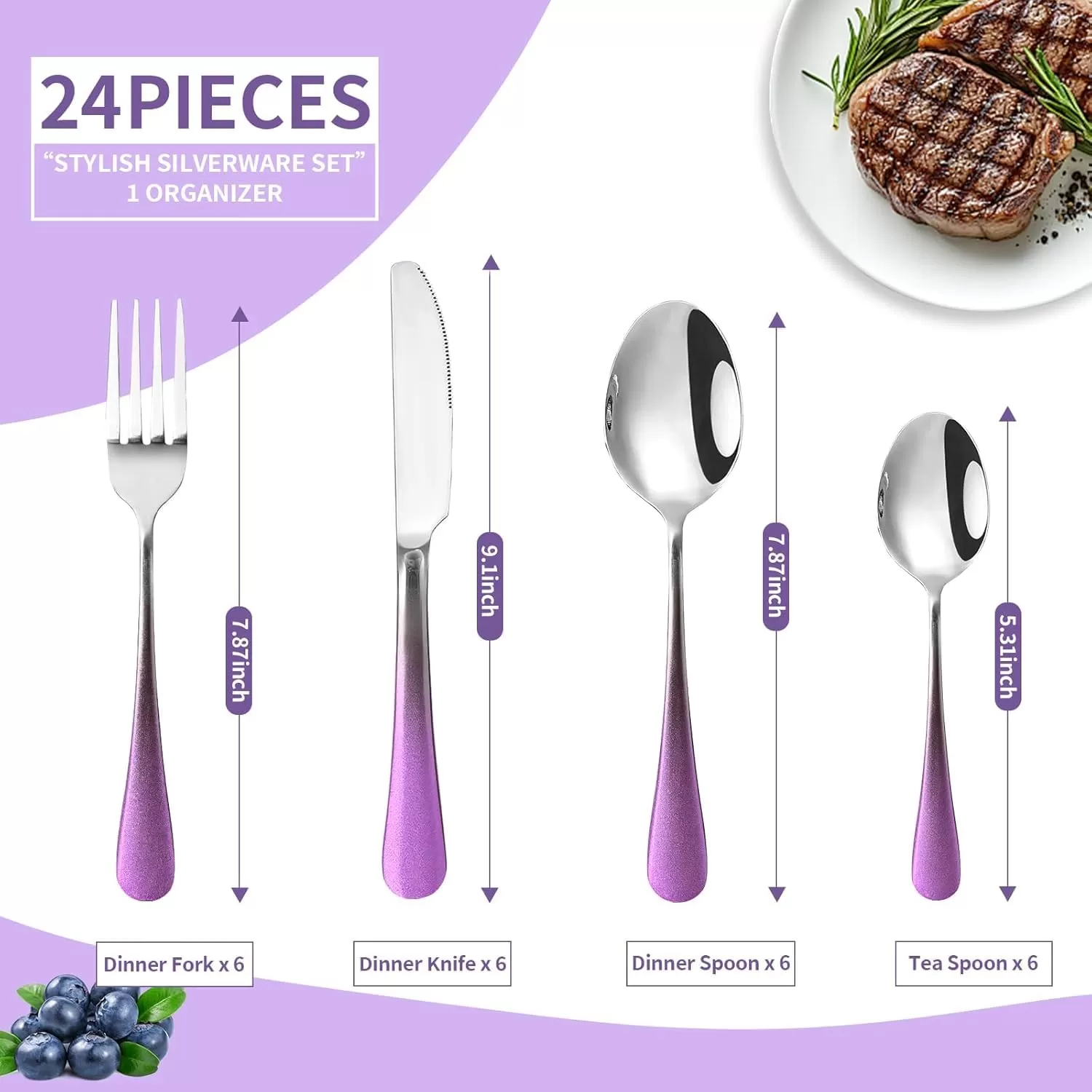 【Service for 6】With a total of 24 pieces, including 6 spoons, 6 forks, 6 knives, 6 coffee spoons, and a gold silverware rack, this set meets the daily needs of your family and is essential for gatherings with friends and family.