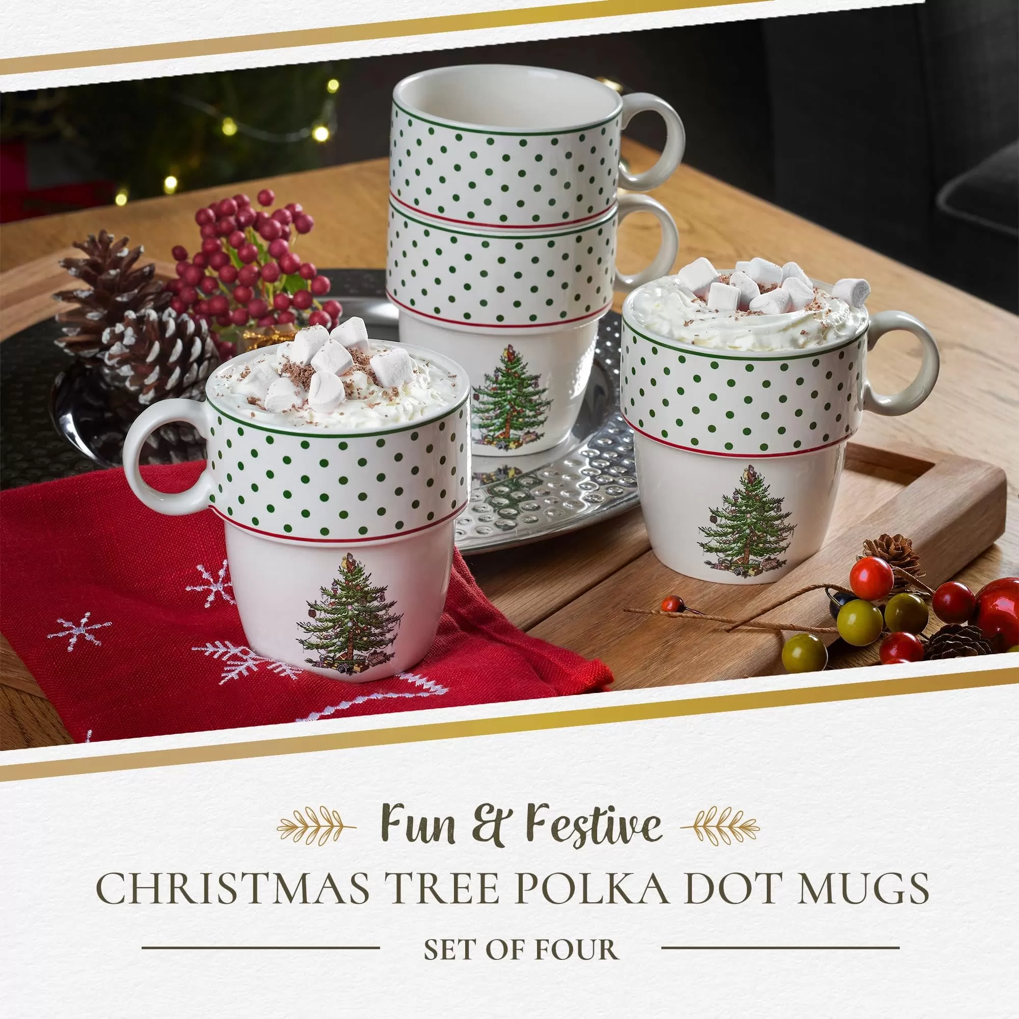 Polka Polka Polka: estas tazas festivas apilables cuentan con un divertido borde de lunares que rodea el icónico árbol de Navidad Spode, agregando un toque caprichoso y alegre a su mesa y reuniones navideñas.