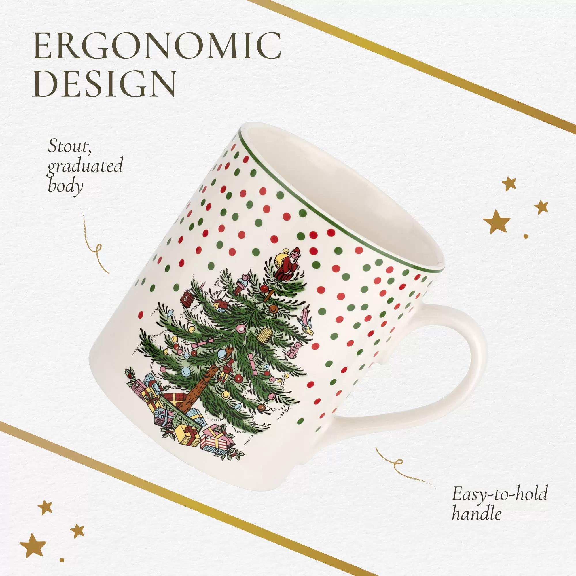 Conception de pois festive: Ajoutez une touche ludique à votre table de vacances avec cette tasse en céramique de 16 onces avec des pois rouges et verts entourant l'arbre de Noël bien-aimé Spode. Un ajout gai à toute occasion festive.