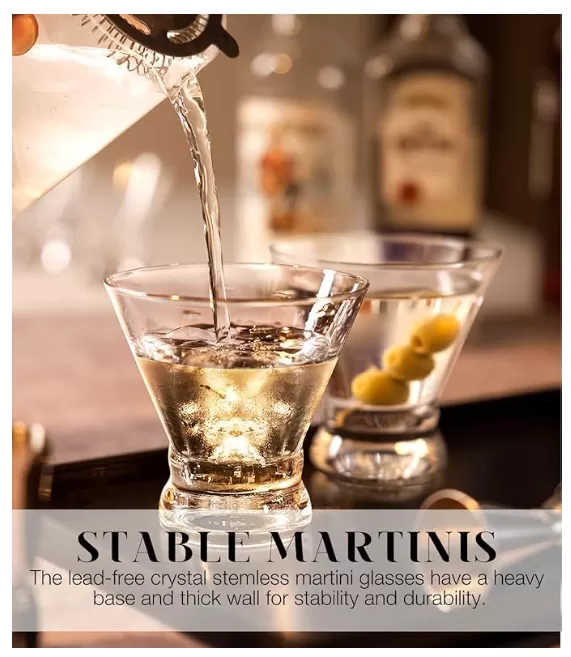 लीड-फ्री क्रिस्टल और क्लासिक डिज़ाइन: प्रीमियम लीड-फ्री अल्ट्रा-क्लीयरिटी स्टर्ड क्रिस्टल से बना। एक आरामदायक पकड़ और आसान उपयोग के लिए इरादा वी-शेप सिनचेड डिज़ाइन और चिकनी रिम है। स्टेमलेस लेकिन अभी भी एक क्लासिक मार्टिनी ग्लास के आकार में और आप इसके भव्य आकार के साथ प्यार में पड़ जाएंगे, जो आपको अधिक सुखद पीने का अनुभव लाता है