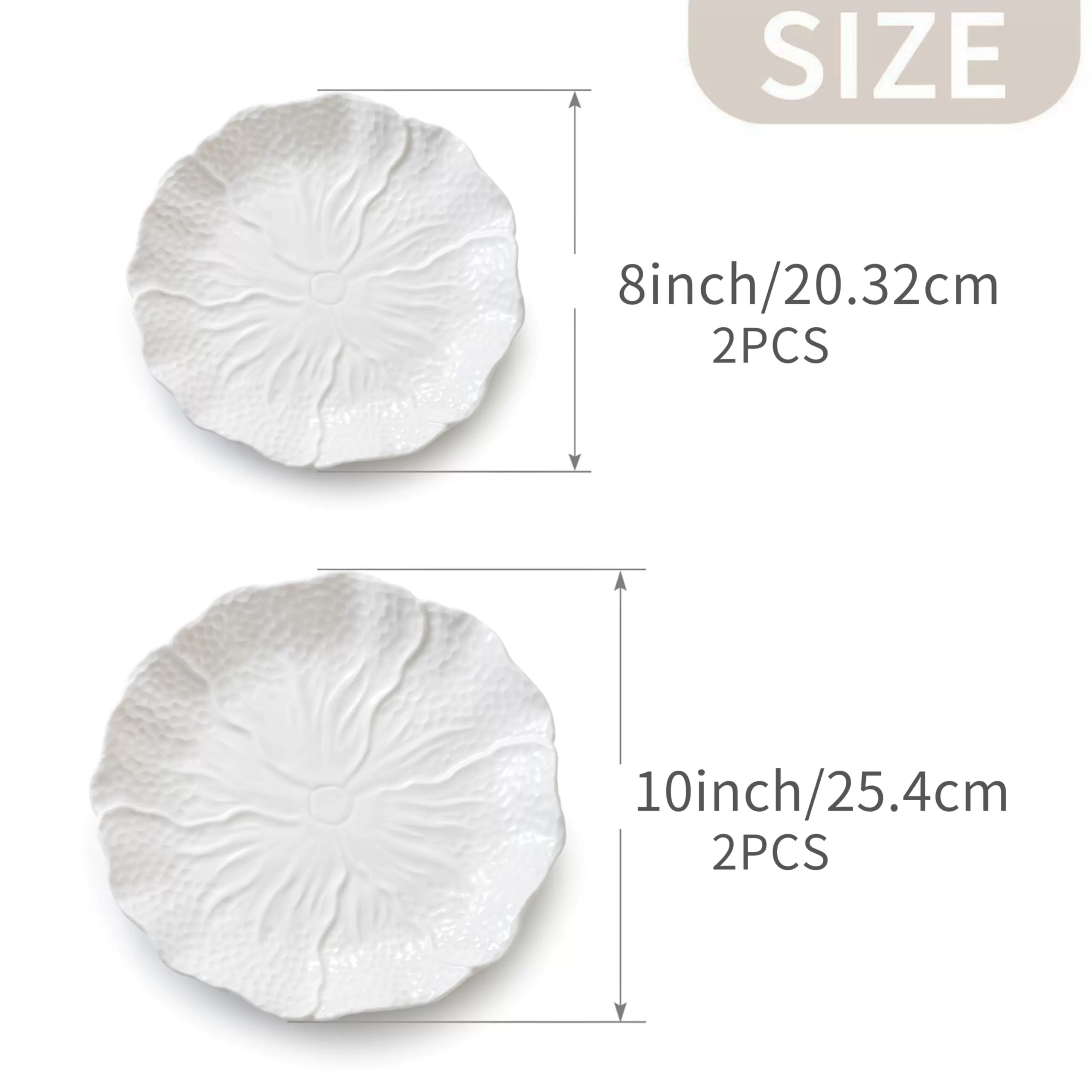 Đặc điểm thiết kế: Áp dụng thiết kế họa tiết lá sen cổ điển màu trắng, thể hiện tính thẩm mỹ thanh lịch và cổ điển. Nó bao gồm hai đĩa 8 inch và hai đĩa 10 inch, tạo thành một bộ tổng cộng 4 món, đáp ứng các nhu cầu phục vụ khác nhau từ món khai vị đến món chính.